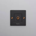 Un întrerupător de lux cu manetă toggle realizată din metal solid, decorată cu textura distinctivă cross knurl și finisaj dual: negru mat și accente în nuanța sofisticată Warm Sunset. Placa frontală este complet metalică, accesorizată cu celebrele șuruburi Buster + Punch tip monedă, iar gravura cu logo-ul completează designul elegant.